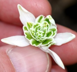 Het klokje van dit oude cultuurgewasje is dubbel. Een verrassing onder de sneeuwklokjes!