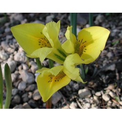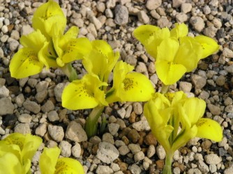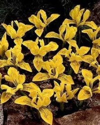 Een kort ( 10 cm hoog) rotstuin-irisje met pittig gele bloem (middenin groen gevlekt). Plant ze 10 cm diep, om ze langer te kunnen houden.
