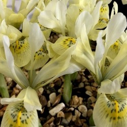 Op korte steeltjes bloeien vroeg in het jaar deze verfijnde irisjes: zeer lichtgeel met witte gloed en geel, donker gestreept lipje.