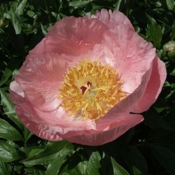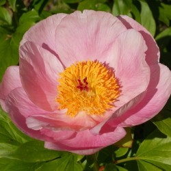 (1950) Zeer vroeg bloeiende tuinpracht! Deze enkelbloemige, warmroze pioenroos bloeit op 60-90 cm hoogte en breedte, het lichtgroene blad blijft lang in topconditie. In het hart pronken de warmgele pollen als een flinke kwast... ruik ook eens aan de bloemen: een heerlijke geur! Dit ras is ontstaan door de volgende kruisingen: P. lactiflora x P. mlokosewitschii x P. tenuifolia.
