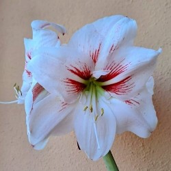 REUSACHTIGE BOLLEN! Deze grootbloemige Amaryllis heeft de grootste bolmaat die we kunnen krijgen en geeft gegarandeerd 3-4 bloeistengels met elk 4-6 bloemen. Wit met een subtiele, rode adering vanuit het midden.