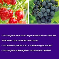 Dit is een baanbrekend middel op het gebied van bladbemesting en plantversterking. Planten worden sterker, gezonder en duidelijk groener, waardoor hun weerstand tegen ongunstige omstandigheden, ziektes en schimmels toeneemt. Bij regelmatige toepassing (1 x per week) maken schimmels als meeldauw, roest, schurft en Botrytis weinig kans. De samenstelling van de meststof is gebaseerd op eenvoudige minerale verbindingen en stoffen die zijn goedgekeurd voor gebruik in levensmiddelen. Salifort is een geconcentreerde, in water oplosbare meststof die hoge concentraties fosfor en kalium bevat. Het is bedoeld voor bladtoepassing bij de teelt van groenten, fruit, landbouw- en sierplanten tijdens het groeiseizoen. Gebruiksaanwijzing Los 40-50 gram Salifort onder stevig roeren op in 10 liter water. Bespuit met deze oplossing de bovenkant van de bladeren tot afdruipen. Herhaal de bespuiting iedere 7-10 dagen. De spuitoplossing is sterk basisch, geen andere meststoffen bijmengen! Test vooraf (door het bespuiten van enkele bladeren en beoordeling na 3 dagen) of het te bespuiten gewas het middel verdraagt. Spuit bij drogende omstandigheden en temperaturen onder 30̊C in de vroege ochtend of de late middag. Salifort is sterk hygroscopisch en moet in afgesloten container onder droge omstandigheden worden bewaard. Voorkom morsen en draag handschoenen bij gebruik. Leveringsmaandenhet gehele jaar