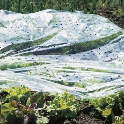 Deze transparante folie is elke 5 cm voorzien van gaatjes (1 cm doorsnee), dat voorkomt een overmaat aan vocht (condens) dat weer terugvalt op de plant. Hierdoor kan de folie (gedurende korte tijd) rechtstreeks over een planten- of zaaibed worden gelegd, het gewicht is maar 20 g p/m². Wel de randen verzwaren met stenen of aarde om opwaaien te voorkomen. Uiteraard is dit ook ideale folie om een tunneltje mee te maken. Afmeting 1,5 x 10 m.