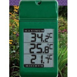 De maxima-minima thermometer is onmisbaar of op zijn minst heel helpend in de kweekruimte, winterberging of tuin. Deze robuuste meter is waterbestendig, hang deze tegen de muur, echter niet in de zon. De bovenste regel laat de maximum waarde na de laatste reset zien, de onderste regel de minimum waarde en de middelste regel de huidige temperatuur. Aan de zijkant zitten 2 knopjes: 1) de resetknop om een nieuwe meetperiode in te stellen en 2) een keuzeknop tussen Celsius en Fahrenheit. Het bereik is tussen -10̊C en +40̊C. Standaard is een batterijtje toegevoegd.