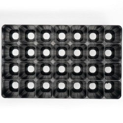 De plaat is 35x21,5 cm (bovenzijde) en elk potje heeft een drainage-gat, dat groot genoeg is om met je vinger de kluit eruit te drukken.