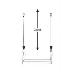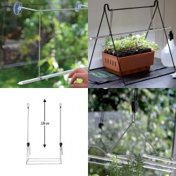 - Frame met lift. Het frame hang je aan schroefogen (niet meegeleverd) met 2 zwarte koorden (van polypropyleen) van 220 cm lengte. Aan de koorden zijn hijsmechanismen bevestigd waardoor je heel gemakkelijk het frame hoger en lager kan hangen. Aan dit frame kunnen 1, 2 of 3 Verlichtingsstrips worden bevestigd. Ideaal om de afstand te vergroten als de planten groeien of als het licht wat steviger of milder mag.
