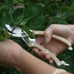 Een fijn snoeischaartje voor de kleinere hand. Het metalen deel is van roestvrijstaal en de handvaten van essenhout. Een stevige schaar met weinig onderhoud!