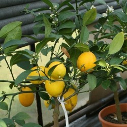 De Citroenboom ruikt heerlijk tijdens de zomermaanden en is een aanwinst op ieder terras. Het is een makkelijke boom die bij ons in een grote pot gekweekt moet worden en tijdens de groei een lichte snoei vraagt om de weelderige groei een beetje in toom te houden. De jonge uitlopers zijn roodachtig van kleur en het blad tamelijk groot (8x5 cm). In een serre bloeit een citrus bijna het gehele jaar door, afgewisseld door vruchtzetting. Op het terras verspreidt de witte (iets paarsige) bloesem een fijne zoete geur. ‘s Winters koel overwinteren, nooit kouder dan 2ºC laten komen.