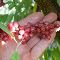 ‘Brilliant Rose’ draagt vanaf vroeg in de herfst (sept-okt) middelgrote, rozerode bessen.