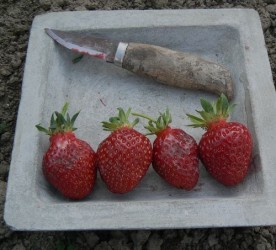 Onze collectie aardbeien bestaat voor een deel uit zeldzame oude rassen, die slechts mondjesmaat leverbaar zijn. Het kan dus zijn dat de wachttijd lang is. In juli wordt jaarlijks een nieuwe teelt door onze kweker opgepot, welke in augustus-september wordt geleverd. In april-mei kunnen we een deel van dit sortiment aanvullen. Houdt u wel rekening met portokosten voor eventuele naleveringen? (2004) "Deze aardbei vervult al uw verlangens…!" verzekert de Franse kweker Delbard. Wat te denken van: grote vruchten (gemiddeld 26 g) met een grappig hoge aanzet van het kroontje, stevig vruchtvlees, massief en dus zonder holtes, gemakkelijk te plukken. Ik heb de smaak omschreven als: “zeer aromatisch, lekker zoetzuur” en nog een extra krabbeltje: “erg lekker”. (bnkk)
