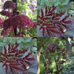 Indrukwekkende 1,5 m hoge schermbloemige, wordt weleens verward met Berenklauw, maar veel kleiner en rondere schermen. De grootste tegenstelling is wel de ruime eetbaarheid: jonge stelen zijn zoet en kunnen met rabarber worden meegekookt om het zuur te neutraliseren. Van het blad wordt thee getrokken. Deze bijzondere cultuurvariƫteit heeft decoratief rode stengels en bloemen! Extra bijzonder: het blad is ook donkerviolet, hoe meer zon, hoe donkerder de kleur van het blad.