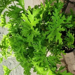 De oude bekende citroengeranium, ik teelde deze al als tiener en maakte er een prachtige bonsai van door voortdurend te snoeien. Gebruik de plant (naast de frisse eetbaarheid) als beschermer tegen muggen! Het iets gekrulde, groene blad tooit zich in de zomer met roze-witte bloemen! We bieden 2 soorten door elkaar aan: de crispum heeft kleiner blad, de graveolens heeft dieper ingesneden blad.