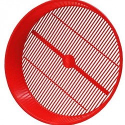Er komen altijd wat blaadjes of takjes mee met de bessenplukker. Heel handig is deze eenvoudige, kunststof zeef met langwerpige uitsparingen, waar het meeste “afval” doorheen valt en de besjes blijven hangen.