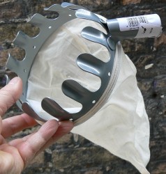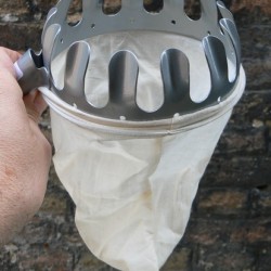 Handig hulpmiddel voor het oogsten van fruit op hogere plaatsen aan de boom. De gekartelde rand haak je achter de vrucht, met een kort rukje zal het rijpe fruit loslaten en in het zakje vallen. Een houten steel of aluminium telescoopsteel (die je elders moet kopen) zorgen voor een hoog bereik.
