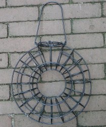 Metalen voederhouder met vulopening voor maximaal 10 vetbollen/mezenbollen en metalen ophangbeugel. (geleverd wordt zonder inhoud)