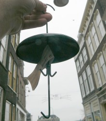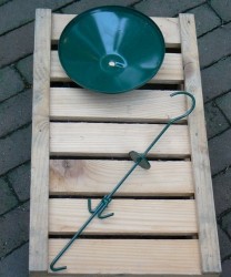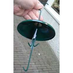 Donkergroene vogelvoederhaakjes met dakje. Hang hier de vetbollen of pinda’s in netjes aan op. Afmeting: 10,5x10,5x40,0 cm