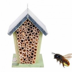 Bijenhuis met zinken dakje. Elke solitaire bij heeft een ander formaat gat (of buis) nodig. De metselbij kiest een diameter tussen 3 en 7 mm, terwijl de maskerbij 2 tot 4 mm prefereert. Een vrouwtjesbij maakt in een diep houten gat verschillende cellen met daarin een eitje en wat stuifmeel en nectar voor de larf. Wilde bijen bedekken hun nesten met leem. Er moet met een aantal zaken rekening gehouden worden bij het kiezen van de locatie van het bijenhuis. Kies een zonnige plek uit de wind en regen. Zorg dat de ingangen aan de voorkant goed zichtbaar zijn voor de bijen. Het is goed als er leem, zand en water in de buurt is. Ook zullen inheemse kruiden, bloemen met veel stuifmeel, struiken en bomen in de buurt voor voedsel zorgen. Dit allemaal zal ervoor zorgen dat je bijenhuis volgeboekt is. Europa telt naast de honingbij vele honderden andere bijensoorten. Deze zelden stekende bijen helpen de bloemen en planten in je tuin te bevruchten. Door de achteruitgang in flora en nestgelegenheden worden vele soorten bedreigd. Dit bijenhuis biedt een uitstekende nestgelegenheid voor verschillende soorten bijen. Afmeting: 15,2x12,7x20,0 cm
