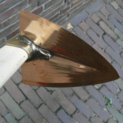 Mooi universeel stuk bronzen tuingereedschap, licht in gewicht en goed gebalanceerd. Om de grond los te maken en het onkruid weg te hakken. Voor het maken van zaadgeulen en het aanaarden van bijvoorbeeld aardappelen. In veel landen is dit model al eeuwen in gebruik als spitgereedschap. De steel is van lindehout. Lengte:128 cm, breedte: 14 cm, hoogte 19 cm, gewicht: 900 g.