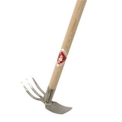 Zeer sterke hak met 3 tanden vork. Essensteel. Totale lengte 150 cm. Bladmaat hak 6,5 cm & vork 8 cm breed. Gewicht 1,15 kg.