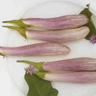 Solanum melongena (Engels: Eggplant) Lange slanke aubergines als deze worden in de Surinaamse keuken “Boulanger” genoemd. Dit ras heeft een bijzondere kleur: wit met lila aders. Groeien ook goed in een flinke pot in de vensterbank. |