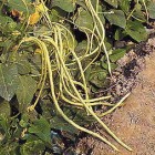 Vigna unguiculata ssp. Sesquipedalis (Engels: Asparagus of Yardlong Bean) Terug van weggeweest: de niet klimmende kousenband, zowaar geen algemene verschijning! Dit roodzadige ras vormt flinke planten (50 cm hoog) en bloeit sierlijk blauwpurper. Per bloemtros ontstaan 2-4 slanke bonen van ca 30 cm lang. Virusresistent, heeft bij uitzaai in juni een goede kans in de vollegrond. |