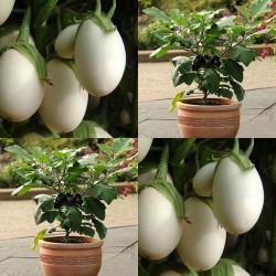 Stevige, compacte planten, die dus ideaal zijn voor de teelt in potten! De spierwitte vruchten (rijpend naar geel) komen in overvloed, in de vorm van een slank ei, 10 cm lang en 50-80 g in gewicht. Geef ze een zonnige plek en een flinke pot.