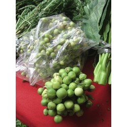Zo klein en ozo fijn! De kleinste aubergines, die ik ooit gezien heb komen uit Thailand en zijn heldergroen, zo groot als olijven of druiven! Een wonderlijke, stevige, rijke smaak, die bijvoorbeeld bij roerbakken goed tot zijn recht komt. Rauw eten kan ook, de vruchtjes zijn bitter als olijven en worden in Thailand gemarineerd in curry. Deze Aziatische historische groente (maar nog steeds een hit!) heeft de potentie om door te breken in Europa. De planten zijn fors en geven een enorme opbrengst. Gelukkig groeien de vruchtjes als trosjes bij elkaar, dat vergemakkelijkt het oogsten! De oogst is vrij laat en de teelt moet in de kas.