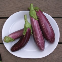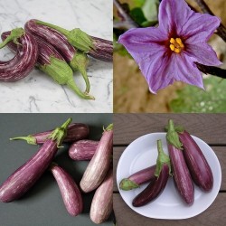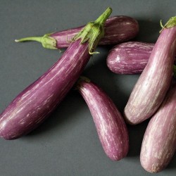 Langwerpige, maar niet al te dunne vruchten (20 cm lang) in paars met witte strepen. Dit ras is zeer populair in Griekenland en Italië, heeft een fijne textuur, is iets zoet en absoluut bittervrij. Bij ons in de vollegrond draagt dit ras opvallend goed, in de kas uiteraard nog beter. Planten hebben wat stekels en hebben een purperen stengel en bloemen.
