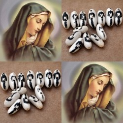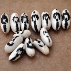 Aan de vergetelheid onttrokken! De boontjes groeien in 16 cm lange peulen en kunnen droog of vers worden gepeld. Jonge boontjes kan je als sperziebonen eten. Ronde witte boontjes met rondom het naveltje een ZWARTE tekening in de vorm van een lofprijzende engel of een vogel en omgekeerd zien velen er een soldaatje in! De structuur is zacht en de smaak gaat richting tamme kastanjepurée of een zachte kekererwt. Heerlijk als humus maar ook in de salade! De planten blijven laag: ongeveer 50 cm.