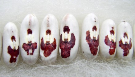 045245. Aan de vergetelheid onttrokken! De boontjes groeien in 16 cm lange peulen en kunnen droog of vers worden gepeld. Jonge boontjes kan je als sperziebonen eten. Ronde witte boontjes met rondom het naveltje een rood-bruine tekening in de vorm van een lofprijzende engel of een vogel en omgekeerd zien velen er een soldaatje in! De structuur is zacht en de smaak gaat richting tamme kastanjepurée of een zachte kekererwt. Heerlijk als humus maar ook in de salade! De planten blijven laag: ongeveer 50 cm.