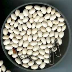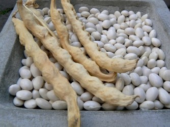 Onze kweker vertelde het volgende mooie verhaal: de bonen heb ik ongeveer in 1970 gekocht op een landbouwbeurs in Warffum. Een oude man maakte me er op attent, hij vertelde me over deze ‘Oldambster Witte’ (spreek uit: ol-dambster). De groene peulen laat je drogen aan de plant tot ze wit zijn. Vervolgens kunnen ze gedopt worden, goed drogen, een weekje in de vriezer (tegen het uitkomen van de eitjes van de bonenkever) en vervolgens koel bewaren. Het is in Groningen een delicatesse en met Nieuwjaarsdag worden ze uit traditie gegeten, verder de hele winter door. (commentaar: Grappig, deze traditie komen we ook tegen in de VS met de Cow Peas, ook een soort droogboon). Deze “Grunninger Dreuge Boon” maken we als volgt klaar: oudejaarsdag in de week zetten, ‘s morgens even afspoelen, tegen 11.00u op een zacht vuur zetten met een stuk spek, verse worst en een droge bink (gepekeld bovenbeen van het varken). Zonder de droge bink moet er wel wat zout bij, samen met een meelderige (=bloemige) aardappel is het een koningsmaal!
