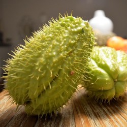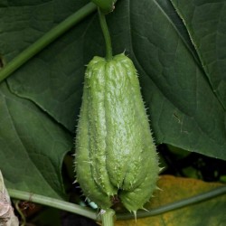 Een vreemde eend in de zaden-bijt vormt dit familielid van de komkommers (Cucurbitaceae)! Ik introduceer de term “naaktkiemer”, want dit fantastische zaad kiemt in de loop van de winter gewoon (binnen!) uit zijn eigen vrucht, dit is dan ook de enige kiemmethode! Bewaar deze prachtige, grofgestekelde vrucht (er bestaat ook een fijngestekeld ras) dus op een lichte, niet te warme plaats. In de warme kamer mag ook, maar dan moeten de scheuten af en toe gesnoeid worden. Vanaf februari-maart is het beter om de groeiende vruchten in potten te planten (eerder mag ook): geheel onder de grond of op zijn kant, zo dat de uitloper in elk geval net onder de grond is geplant. Water naar behoefte, aarde droog = water geven. Bij mooi weer af en toe met de plant naar buiten is gunstig voor een stevige groei. Uiteindelijk moet de plant (na de vorstperiode dus ongeveer in mei) lekker in de zon naar buiten en uitgeplant worden in de vollegrond. Deze zal aan de klimmende of kruipende ranken in zomer en herfst een enorme oogst geven. Er bestaan ook Chayotes met een gladde schil (060405), deze zijn net zo smakelijk, ze doen het beide goed in ons klimaat, het ene jaar doet de gladde het beter, het andere jaar juist de gestekelde... Over de bereiding van deze Midden-Amerikaanse vrucht vind je veel ideeën op internet. Opvallend is, dat de zachte structuur behouden blijft, je bakt of kookt ze dus niet tot moes. Vergelijk de smaak met die van een sappige aardappel, je kan er dus mee koken, bakken, maar ze kunnen ook rauw gegeten worden met een beetje citroen en wat zeezout...! De gehele plant is overigens eetbaar: bloemen, bladeren, groeischeuten en wortelknollen. De plant vormt mannelijke (10-30 bij elkaar) en vrouwelijke (solitaire) bloemen aan 1 plant, eenslachtig en eenhuizig dus.