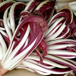 Een prachtige roodlof met lange smalle knalrode, krullende bladeren en dikke, spierwitte nerven. De geoogste kropjes mogen alleen Radicchio di Treviso heten als je ze in beschermde streken in Italië teelt, geef ze dus gerust een andere naam en geniet ervan! Enkele weken voor de oogst kan je de kropjes samenbinden of onder een donkere emmer laten bleken, een traditionele teeltwijze gebeurt als witlof zonder dekgrond, de wortels in een laagje grondwater in een donkere tank.