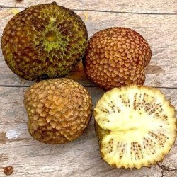 Deze grappige, zeer onbekende vrucht groeit aan een vrij compacte boom, die je goed als plant-in-pot kan houden. In de zomer naar buiten en ‘s winters in de kamer. Na enkele jaren groei wil de plant al bloeien met fraaie, bolronde bloeitrossen. De ronde vruchten zijn 5-10 cm in doorsnee en hebben de kuiltjes van een golfballetje. De unieke smaak doet denken aan een appel met de textuur van een peer. De plant of boom groeit in West-Afrika en houdt van veel water. De vruchten worden niet commercieel geteeld, maar wel op lokale markten aangeboden, zeer geliefd bij de bevolking (en veel dieren) waar de plant in het wild groeit.