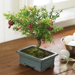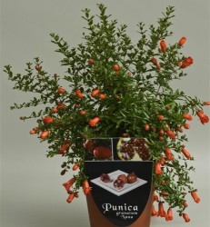 De bakermat van deze interessante kamer- en kuipplant ligt langs de Middellandse Zee. Ginds een kleine struik, hier uitgegroeid tot een compacte, flink volle plant van 50 cm hoog. De massa's glimmend groene blaadjes en de feloranje trompetvormige bloemetjes maken de plant tot een opvallende aanrader. Door insectenbestuiving groeien de bloemetjes uit tot heuse granaatappeltjes. Deze mini-granaatappel is ook heel geliefd bij bonsaikwekers.