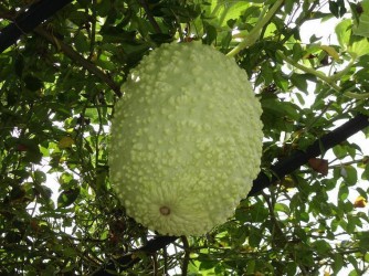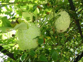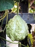 Nee, het is geen ziekte, die (decoratieve!) wratjes, die soms dicht bij elkaar, soms verspreid op de vrucht prijken. De vorm is als een grote peer (25x15 cm) in een olijfgroene kleur.