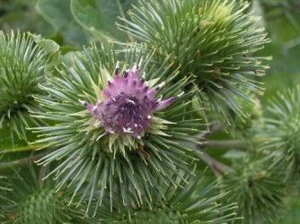 Deze prachtige plant groeit bij ons in het wild, je kent vast wel de bekende rijpe bloembodems die aan je kleren blijven klitten, wij gooiden als kind die klitten naar elkaar. Achteraf best gevaarlijk, want ze zijn gevaarlijk voor huid en ogen... In de vacht van dieren blijven deze hangen en zodoende wordt de plant over grote afstand verspreid. Maar het dier heeft er veel last van.