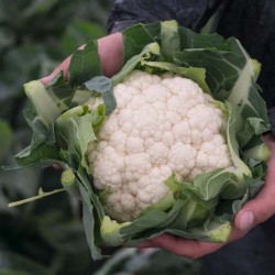Bloemkool verlangt een voedzame, goed bewerkte en vochthoudende grond. Uitplanten op 50 cm. Wilt u eens een kwekers-topper in de tuin? Dit helderwitte, Amerikaanse topras (OP) groeit snel en betrouwbaar in 70-80 dagen (na planten) tot oogstbare bloemkool. Goed zelfdekkend, d.w.z. er groeit uit zichzelf blad over de kool, zodat deze wit blijft. Geschikt voor zomer- en herfstteelt omdat dit ras zowel tegen hitte als kou kan.
