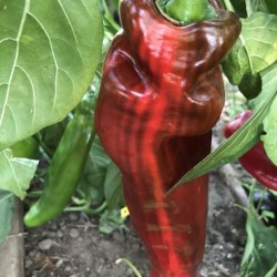 Langwerpige blokpaprika, die wel taps toeloopt, maar niet in een punt uitloopt. Deze dikwandige paprika’s zijn heerlijk zoet, dikwandig en groot! Het grappige is de deuk die bijna bovenin ontstaat, waardoor de vruchten op vogels (Kaketoe) lijken. Deze Franse paprika rijpt van groen naar donkerrood met bruinrode strepen.