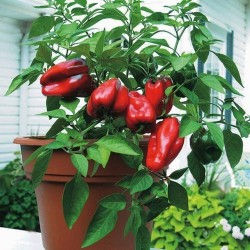 Een fantastische pot-paprika, de plant blijft compact (50 cm) en de vruchten zijn bijna net zo groot als een gewone (blok)paprika! Deze zijn heerlijk zoet-aromatisch en rijpen van groen, via paars naar rood. Hoe rijper hoe zoeter…