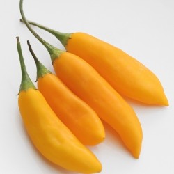 Dit meerjarige ras (ruim vorstvrij overwinteren) komt uit Peru en geeft vruchtjes van 5 cm lang en 1 cm breed, rijpend van groen via citroengeel naar lichtoranje. De smaak heeft aroma’s van boontjes en citrus als je dat tenminste nog proeft want dit is de heetste Capsicum baccatum die we kennen: 100.000 SHU!