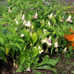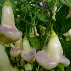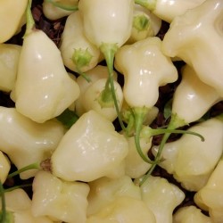 Dit geweldige, klokvormige pepertje teel je alleen al vanwege het uiterlijk en de bijzondere kleur! Aan de forse planten groeien volop helderwitte klokjes, die afrijpen naar crème. Peter Merle uit de Canarische Eilanden selecteerde en/of kruiste met de Finse peper Aji Fantasy en kweekte er de helderwitte kleur in... Een hebbedingetje pur sang en mild van smaak.