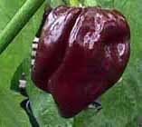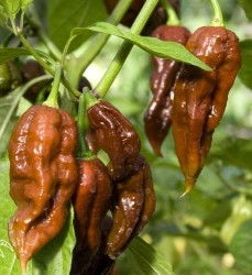 Mooie geblokte, kastanjebruine peper, iets ingedeukt hier en daar. Afmeting 5 cm lang en 3 cm breed. Het aroma is fruitig, iets gerookt. 250.000-425.000 SHU! Een hele hete dus!