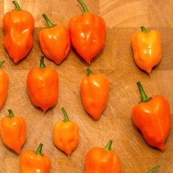 Zeer populair in Midden-Amerika! Een van de heetste Adjuma's (100.000-300.000 Scoville!). Deze helder oranje variëteit is iets langwerpig tot blokvormig of hartvormig. Tip: laat de vruchtjes tijdens de bereiding heel en haal ze achteraf weer uit het gerecht. De planten kunnen in een pot binnen overwinteren, snoei deze na de vruchtrijping terug voor nieuwe groei.