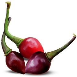 De compacte planten (60-80 cm) vormen decoratief donkergroen tot paars blad aan paarse stengels en steeltjes. De druppelvormige vruchtjes starten bijna zwart en blauwpaars en rijpen via oranje naar rood. Al deze kleuren vind je dus aan de planten, dat geeft een fraai gezicht! De smaak wordt zeer gewaardeerd door de ware peperliefhebber, het is een kruising tussen Braziliaanse Biquinho (zeer mild) en Chupetinho pepers (heet). Ze zijn middenheet, ongeveer 10.000 SHU