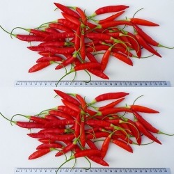 Fraaie vruchtjes, 5-6 cm lang, in de vorm een kerstpegel...! Dit Boliviaanse ras wordt 80-100 cm hoog en rijpt van geelgroen, via oranje naar rood. De vruchtjes hebben een fijne naar citrus neigende smaak en zijn flink heet: SHU 50.000