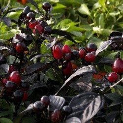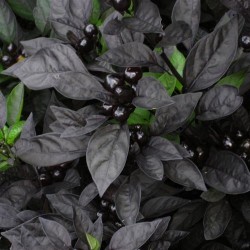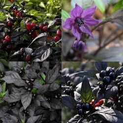 Alles is fraai aan deze peper: het zeer donkere blad, de lilablauwe bloei en de kogelvormige, bijna zwarte, glanzende pepertjes die rood narijpen. De planten blijven compact (50 cm) en de peper is uitgesproken heet!