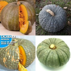 Pompoenen kunnen probleemloos buiten worden geteeld. De groeitoppen kunnen regelmatig worden gesnoeid en zijn eetbaar! Oogsten tijdens droog weer geeft de beste bewaarbaarheid. Alle pompoenen zijn eetbaar! Bij sommige soorten vermelden we de synoniemen, dat zijn de namen waaronder het soort ook bekend is. Bij andere soorten vermelden we zeer gelijkende soorten, heeft u duidelijk voorkeur voor een van die bij elkaar vermelde soorten, geef dat dan duidelijk aan. Deze Spaanse smaaktopper komt in 2 uitvoeringen voor, onze kweker kan geen uitsluitsel geven welk uiterlijk er zal gaan groeien, maar het is in elk geval een Cucurbita maxima met zeer smakelijk vruchtvlees. De ene uitvoering heeft een bobbelige schil zoals de Italiaanse Marina di Chioggia, de ander heeft een gladde schil en lijkt op Crown Prince en Sweet Mama. De diameter is ongeveer 30-40 cm, een zeer handzaam pompoentje om lekker mee te koken!