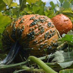 We zijn erg blij dat we het mooie sortiment van Outstanding Seed Company kunnen verkopen. Dit Amerikaanse bedrijf uit Beaver Falls (Pennsylvania) is gespecialiseerd in het kweken en verbeteren (door traditionele veredeling) van pompoenen. Ze letten daarbij op verbetering van kleur, vorm, smaak, ziekteresistentie, oogsttijdstip, oogstgrootte en bewaarbaarheid. Fijn om rechtstreeks bij de bron te kunnen kopen! Een halloweenpompoen met een vrolijk extraatje: de oranje vruchten krijgen sierlijke, oranje of donkergroene wratten! Verwacht een flinke oogst van middelzware vruchten: 10-15 kg. De rankende planten blijven lang gezond, de resistentie tegen meeldauw is hoog.