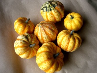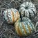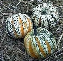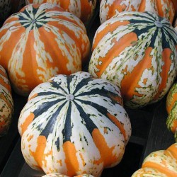 Een bontgekleurde vrucht: crème-witte tot gele kleur met donkergroene en oranje strepen langs de diepe overlangse groeven. Opvallend vanwege decoratieve vorm en kleur, en niet minder vanwege zoetgehalte en smaak ! Plant draagt kleine vruchten in overvloed (gewicht 200-400g, afmeting 8-15cm). De smaak is 1-2 maanden na de oogst optimaal. De vruchten hebben de vorm van 'Sweet Dumpling', dus kunnen rechtop staan.